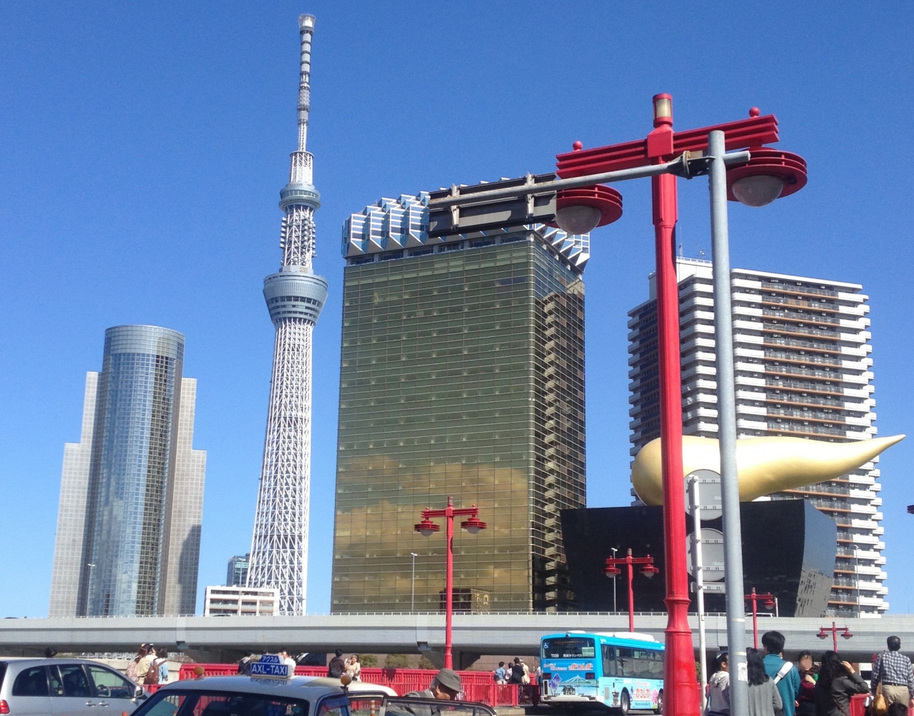 一方、この橋から、墨田区役所とアサヒビールの建物に挟まれた東京スカイツリーを眺めることが出来るため、この橋の歩道から、カメラを構える観光客が大勢います。