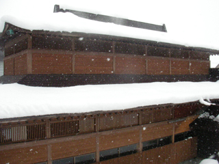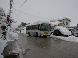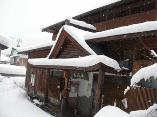 戸狩野沢温泉駅から野沢温泉行きバスに乗って、温泉街の入り口の中尾バス停で降りて外湯めぐりを初めます。雪の坂道を上っていくと、前夜からの積雪で除雪車がフル稼働で、気をとられていたら共同浴場の中尾の湯を行き過ぎてしまいました。少し戻ると立派な屋根に湯抜きがある建物がありました。