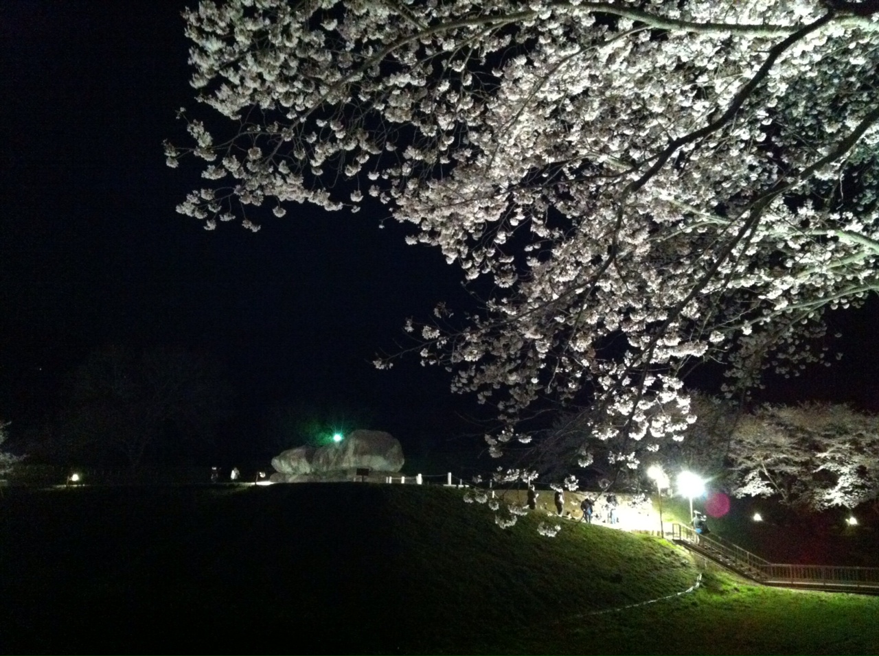 お天気が良い日に、明日香に行ったことのない義母を連れて旅しました。ちょうど桜が見頃でライトアップもしている日(2013/4/3)で、巨石むきだしの墳墓跡と桜ライトアップとい取り合わせが最高でした。昼間もフォトジェニックな場所ですが、夜もシャッターチャンスを求めて大勢がカメラを構えていました。ライトアップは3月後半~4月上旬とのことですので事前に確かめて行かれたほうがいいと思います。必見です。