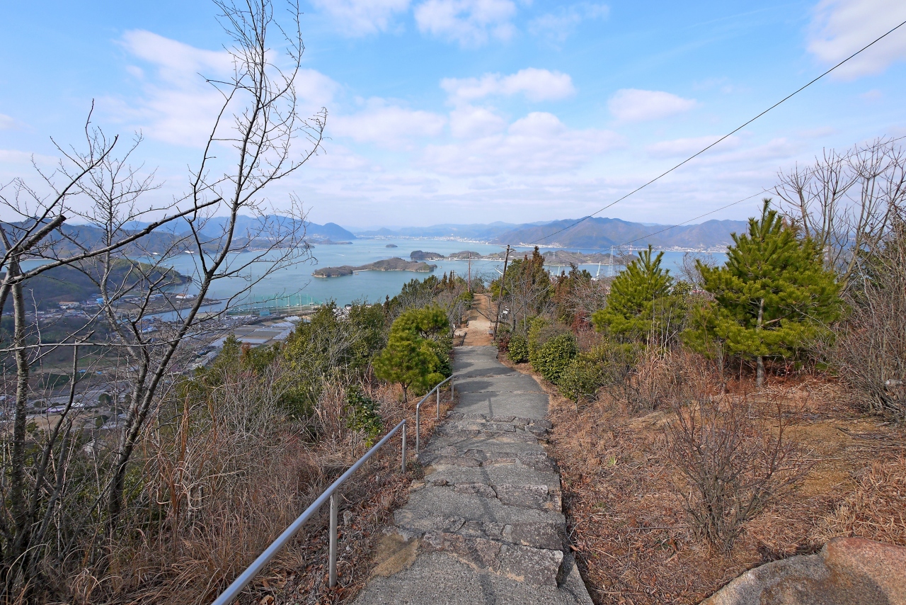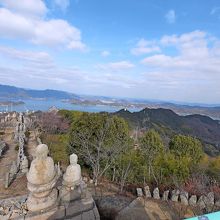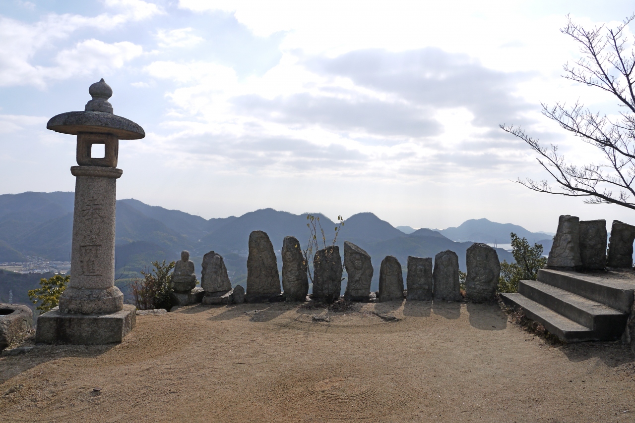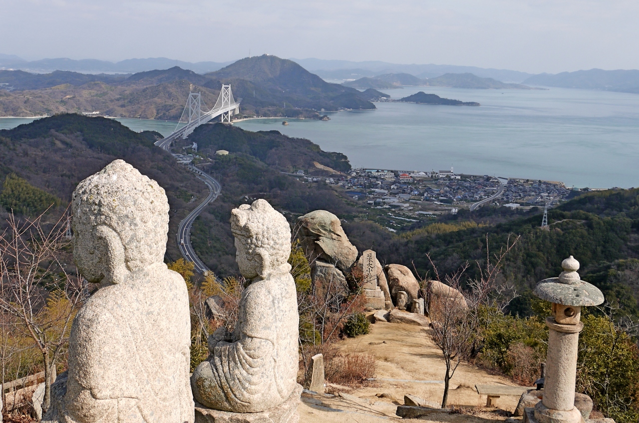 ここの眺望もまた石像群も素晴らしい!ここには1827-1830に重井の豪商 柏原伝六が神道,儒教,仏教に加え,キリスト教もふくめて「一観教」を開き,白滝山上に清浄世界を作ろうとした.ところせましと石像,堂々と十字架観音もある.ここに石像を持ってくるだけでも大変だ.また瀬戸内海の島々も素晴らしかった.絶対のおすすめの場所!