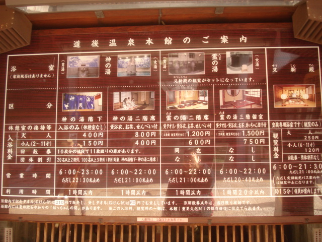 道後温泉と言えばここにいかないわけにはいきません。情緒のある銭湯の趣で朝の6時から営業しています。料金によっていくつかのパターンがありますが中の歴史的な温泉を楽しむにはどのレベルでもいいと思います。
