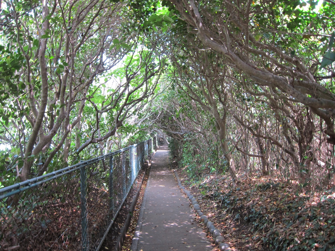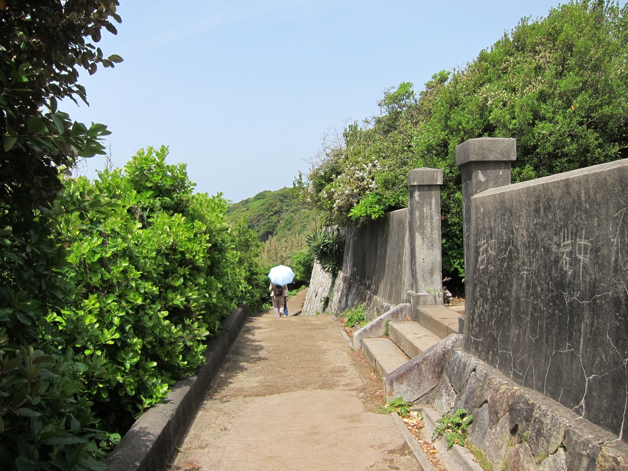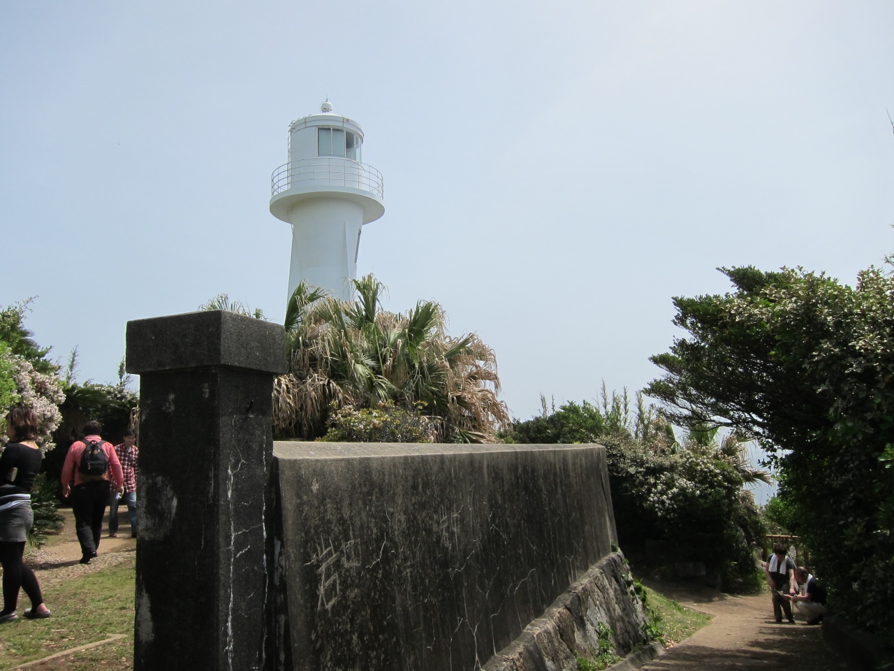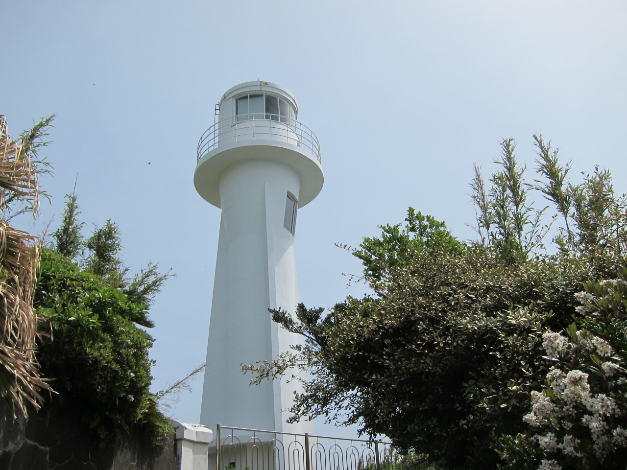 足摺岬展望台に登ったとき、左側に天狗の鼻、右側に灯台が見えました。海岸から直立する絶壁の上に立っていますが、周囲はウバメガシの森に囲まれ、下が見えないのであまり怖くありません。灯台に登れるわけではないので展望もあまりよくありません。展望台や天狗の鼻から絶景を楽しんでください。