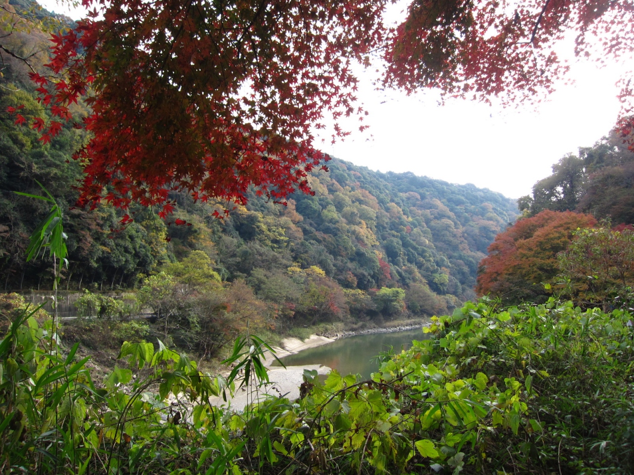 川沿いに緑、赤、黄色の色とりどりの木々がありよかったです。