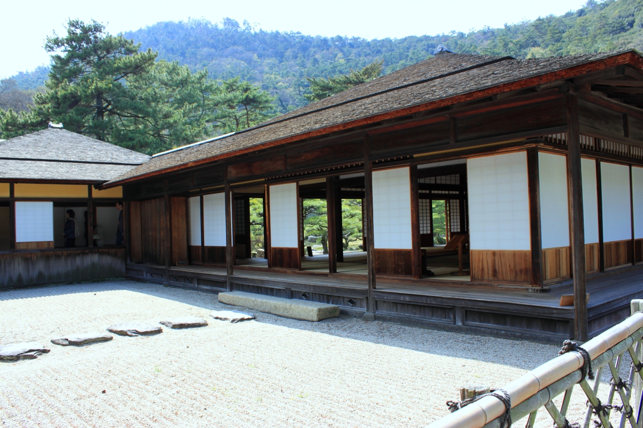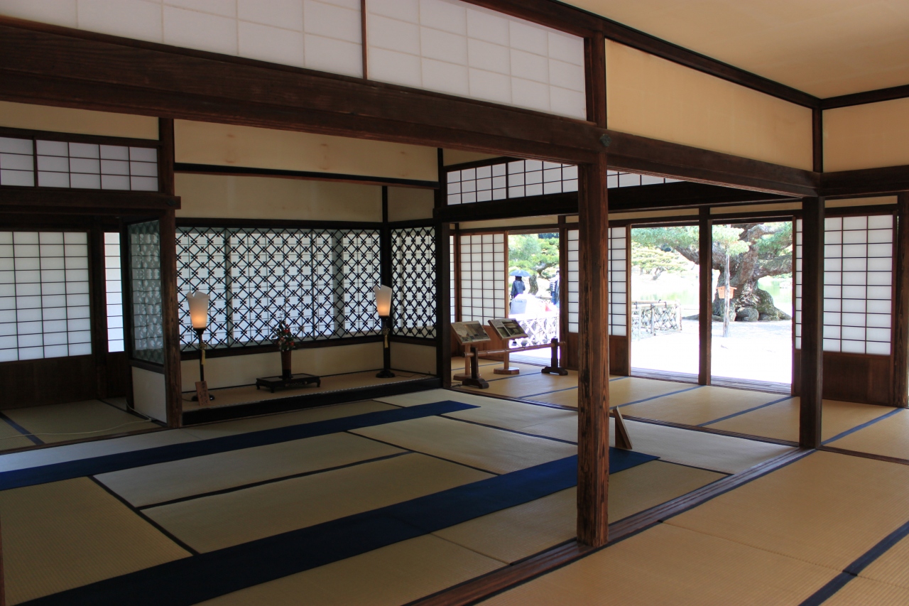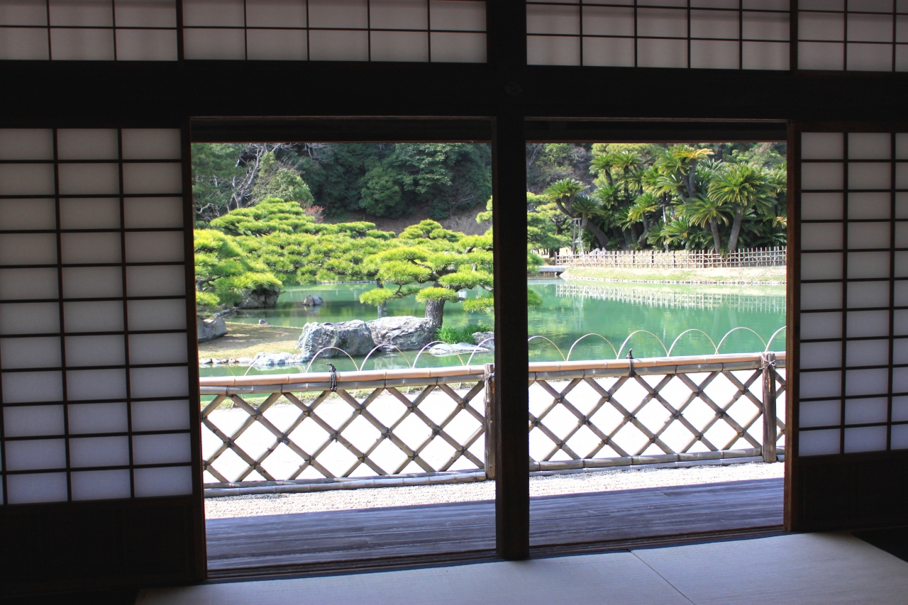 歴代の藩主が使用した茶室で、江戸時代は「大茶屋」といわれていました。玄関を持たず、どこからでも出入りできるように、いろいろなところに沓脱石(くつぬぎいし)が置かれた、数奇屋づくりの建物です。名前の由来は、唐代の詩の中の「水を掬すれば月手にあり」の一句から取ったものといわれています。園内の中心的な建物で、特に掬月の間から南湖を望む景観は、他に類を見ないすばらしい景観です。