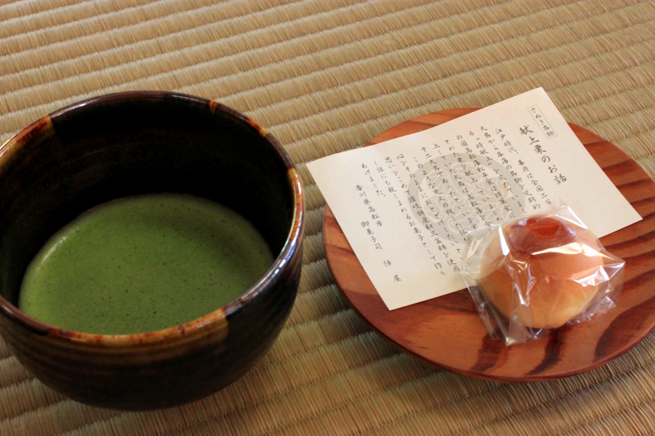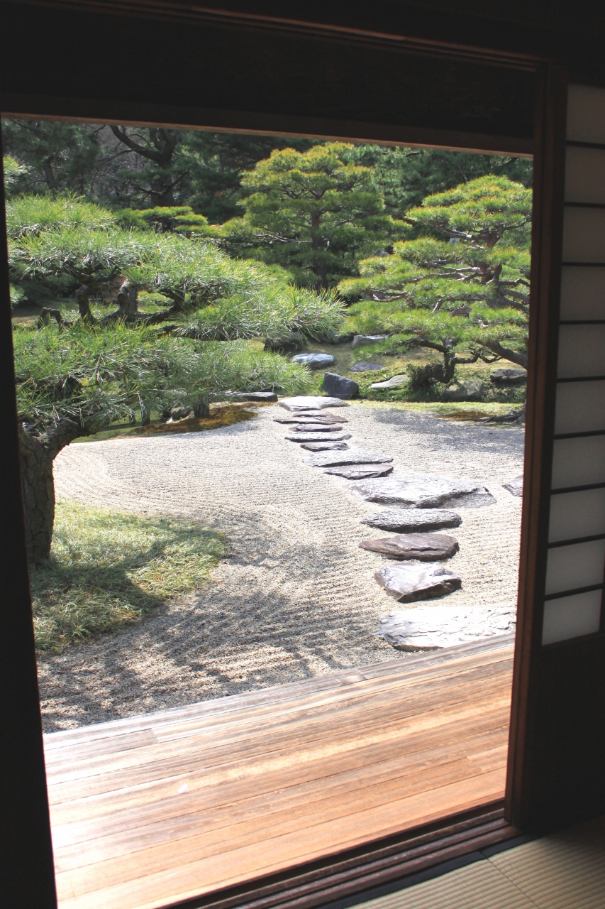 広い建物の中でお抹茶と和菓子 ¥500 を頂きながら庭園を眺める。