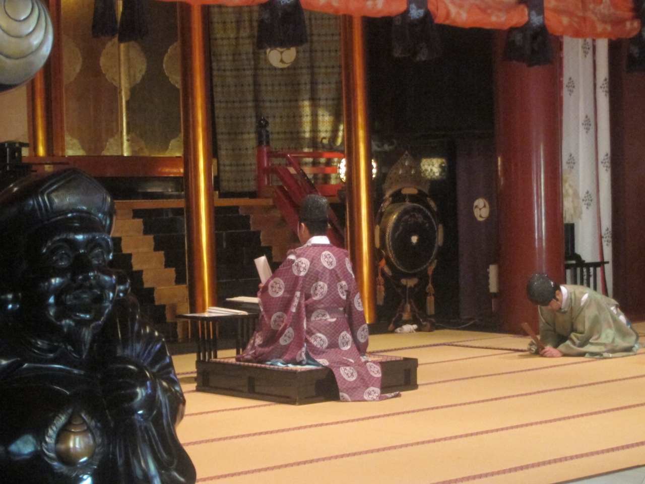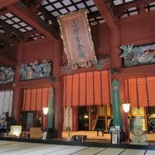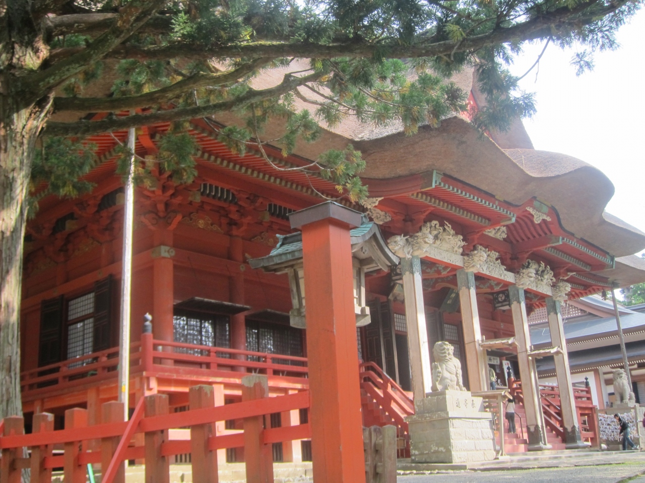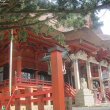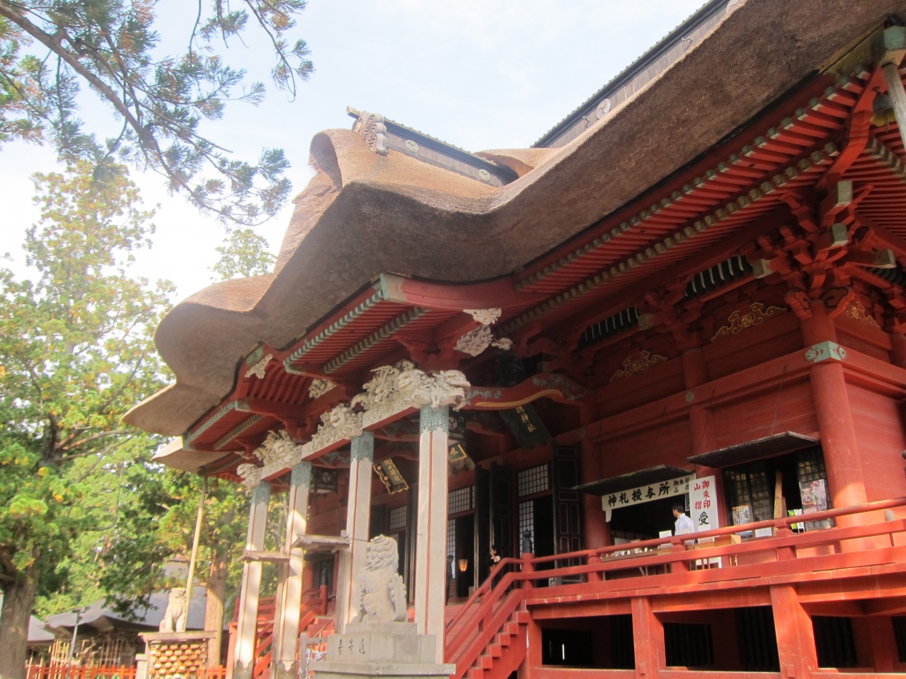 鶴岡駅前からバスで50分。終点の羽黒山頂まで行きます。三神合祭殿はバス停から杉林の中を少し行くとあります。全体朱塗りの社殿で靴を脱いで中まで入ることができます。中は参拝者のためにお祓いなどもやっていますので静粛に。社殿の正面の所でお守りなどを購入することができます。