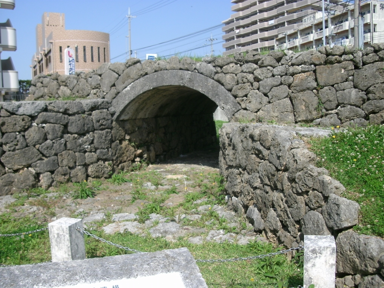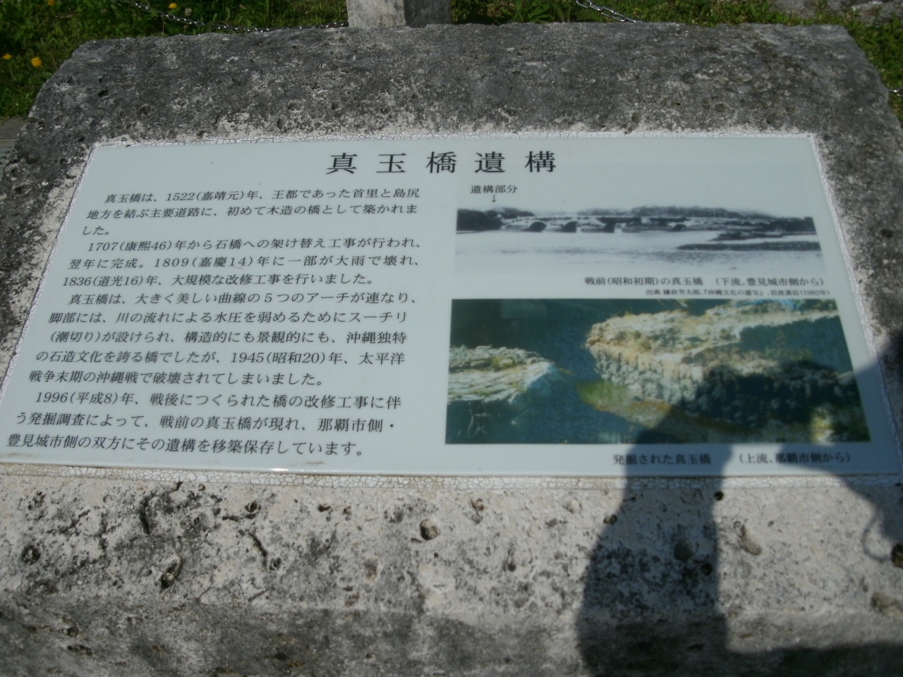 「真玉橋」は、沖縄県の那覇市と豊見城市の間を流れる国場川にかかる橋です。最初の橋は、1522年に首里と島尻地方を結ぶ交通の要として築かれました。その橋は木橋の五連橋で、その後1837年に大改修されて六連の石橋になりました。琉球王国消滅後も存在していたが、1945年沖縄戦の際退却する日本軍によって破壊され、戦後米軍によって鉄橋が、さらに1963年には琉球政府によってコンクリート橋が架けられていたが、2002年に再びアーチ橋として架橋されました。この架橋工事の際に旧アーチ橋の遺構が発見され、現在、国場川の両岸に石造の見事な橋の一部が保存されています。