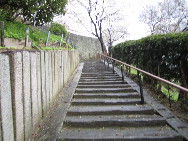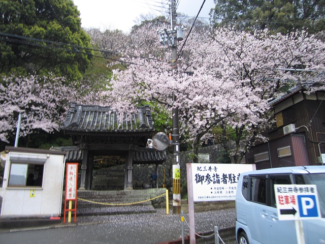 路地を歩いていくと、突き当たりに紀三井寺の山門が見えますが、思ったよりもこぢんまりとした印象です。また、今回訪問した際には、ロープが張られていて山門をくぐることはできませんでした。山門脇のプレハブ小屋にいる係りの人に入山料(200円)を払うといきなり急な上り坂が始まります。一応、石段とは別に舗装された道路も併設されていたので、足の悪い人はタクシーなどで本堂近くまで上がることも可能です(そういえば、途中で自動車も停まっていたような。山上の駐車スペースは保証の限りではありませんが)。坂道を上がって行く途中は桜が見事ですよ。
