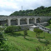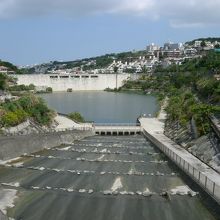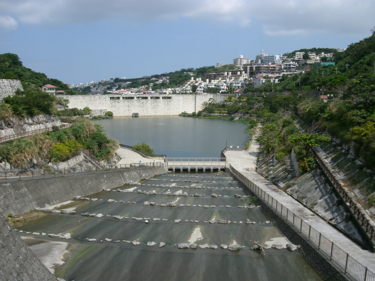 「金城ダム」は、金城の石畳を降りて左へ徒歩で5分ほど行ったところにあります。二級河川・安里川に建設された洪水調節のためのダムです。ダム本体の表面には石垣を模して琉球石灰岩のプレートが貼り付けられており、水際には土が盛られ水生植物が植えられています。遊歩道やトイレ、駐車場など周辺は大変綺麗に整備されており、ピクニックや散策にぴったりです。デザイン的にも面白いダムなのでダムマニアの方にもお奨めです。