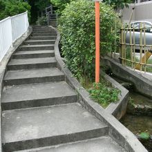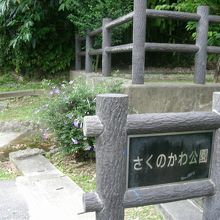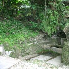 「さくの川」は、那覇市内、首里坂下通りの“山川”の信号の北方150m位の住宅街の中にあります。急な崖の下から湧き出る地下水を、約10個の琉球石灰岩を加工してつなぎ合わせ、水を引いたという人々の知恵が生み出した共同井戸です。水をくむ広場は扇形に造られ、周囲の地形との調和がとれています。ここの水は飲料水や生活用水だけではなく、紙漉にも利用されていたそうです。周囲の緑と水辺は住宅街にあって、オアシスの様な散在でした。
