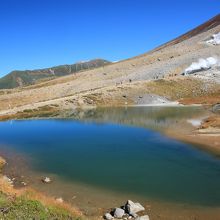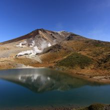 雲一つない紺碧の空、その碧さを受けて旭岳山頂の姿を見事に映し出す「姿見の池」、まさに名前の通りでした。近くで見ると意外と浅く、深い所でも水深は4~5mほどだそうです。