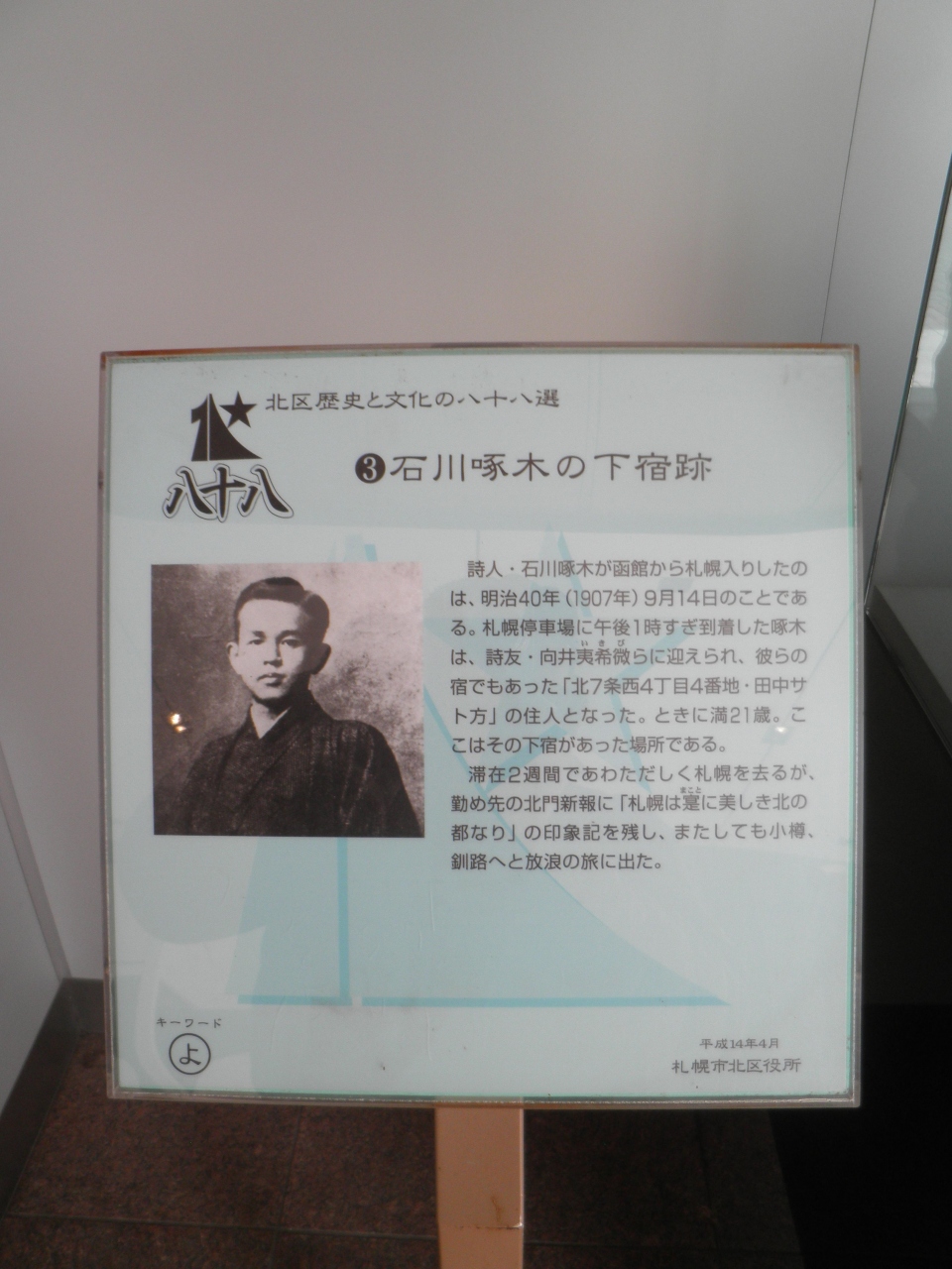 JR札幌駅の西側にあるヨドバシカメラ前の交差点のヨドバシカメラの向かい側にあるビルの軒先に隠れるように石川啄木の下宿跡があります。 胸像と簡単な説明文があって、見つけるとチョッとうれしいです。 胸像はちょっと「よく来てくれたね」と歓迎してくれるように見えます。2週間しか居なかったそうですが、札幌について「寔(まこと)に美しき北の都なり」と述べたそうです。