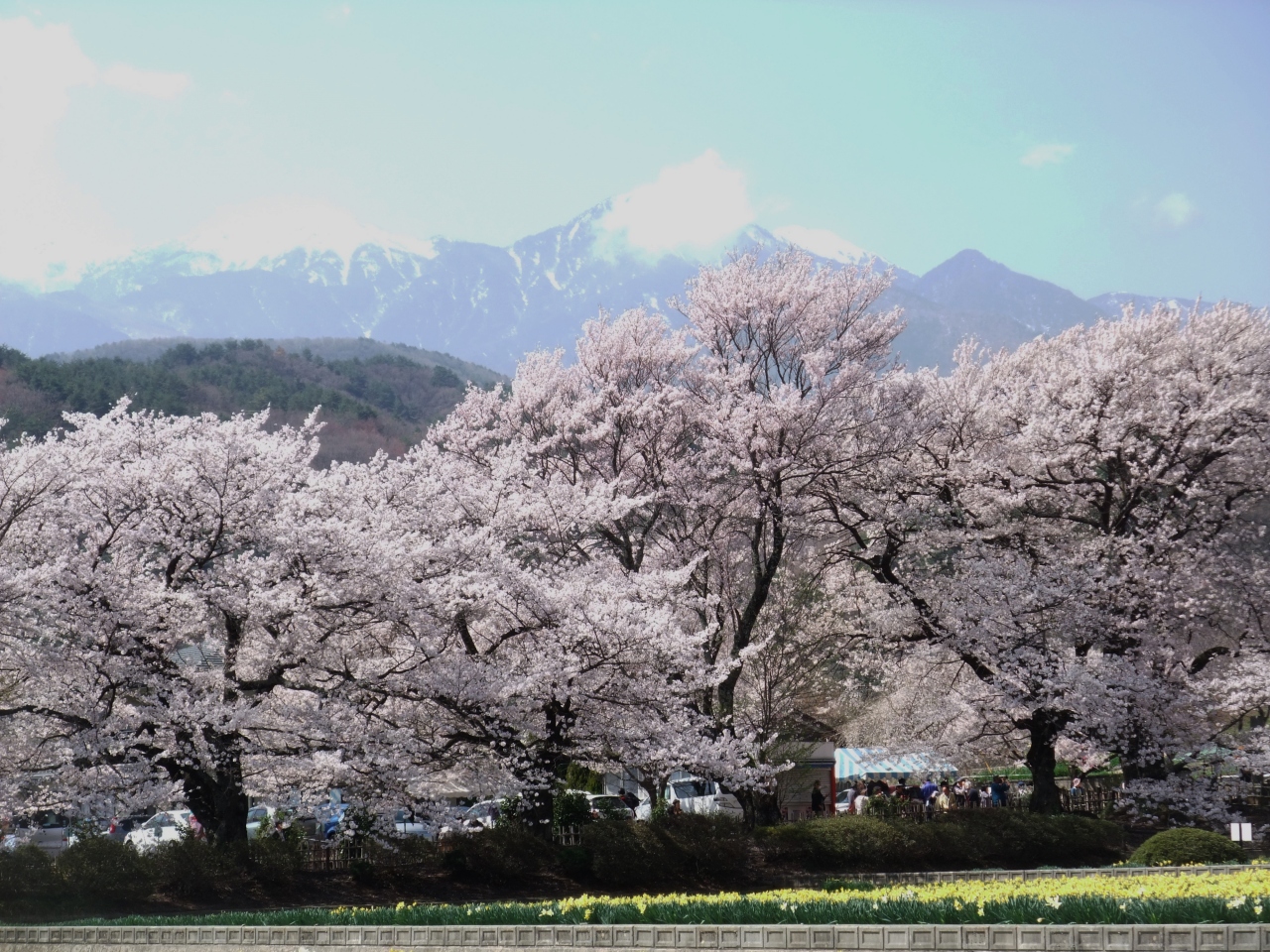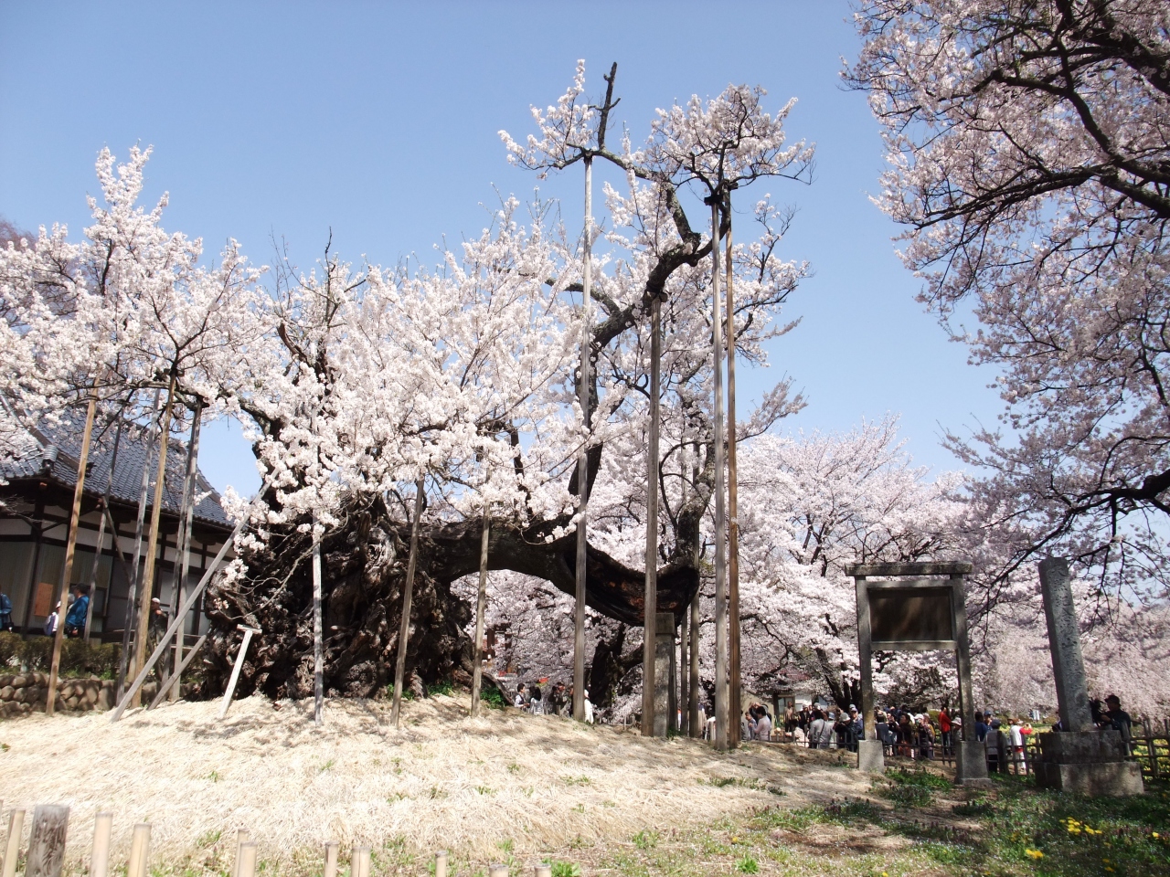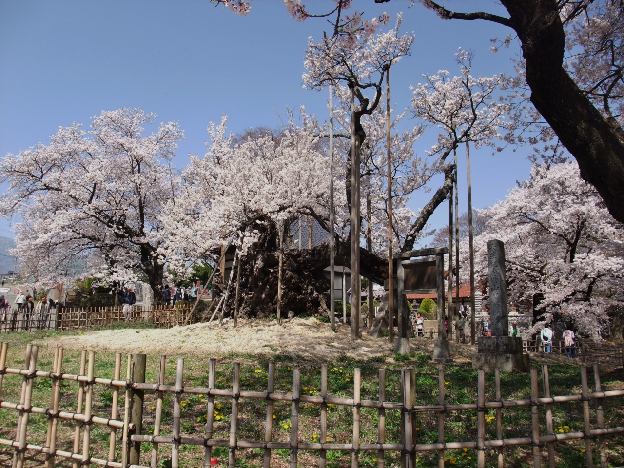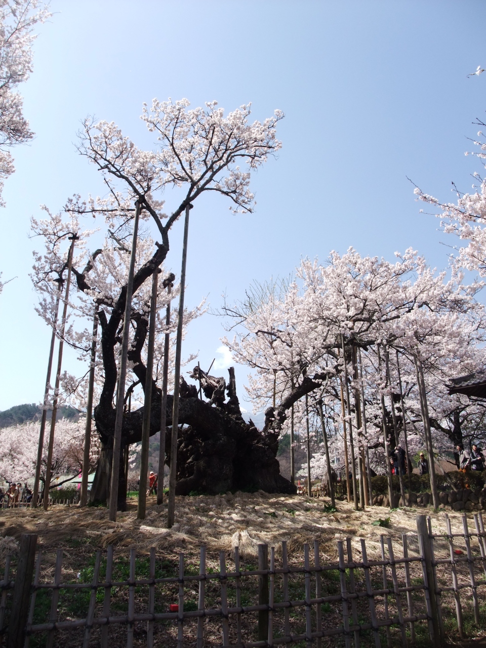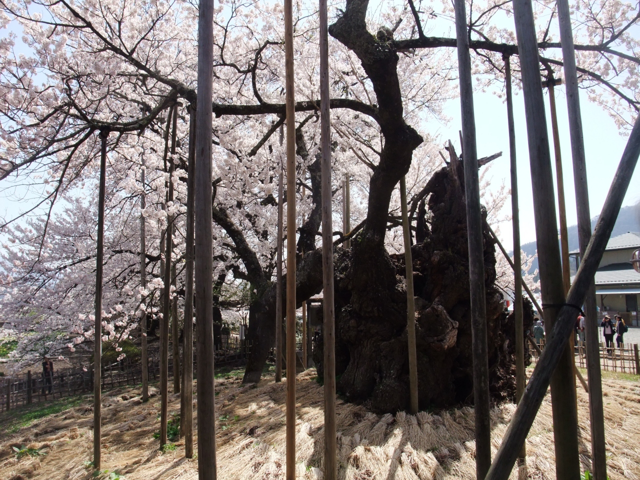 新日本名木百選にも選ばれている山高神代桜は、樹高10・3m、根元周11・8m、枝張り 東西方向17・3m、南北方向13mある古木の巨大桜です。 昭和34年に、この地方を襲った台風で、幹が折れ、すっかり樹形を変えてしまい、今の姿になったのだそうです