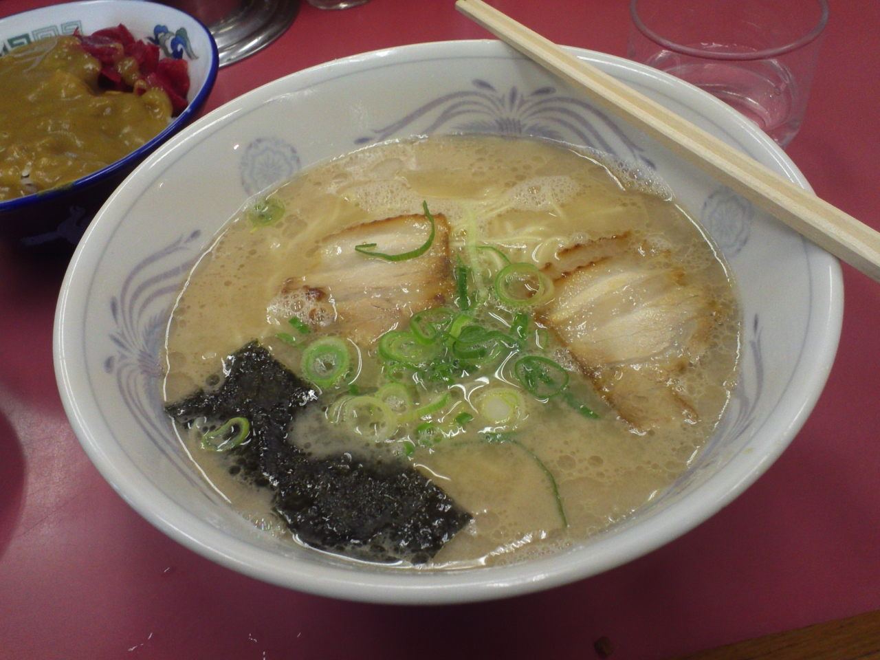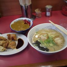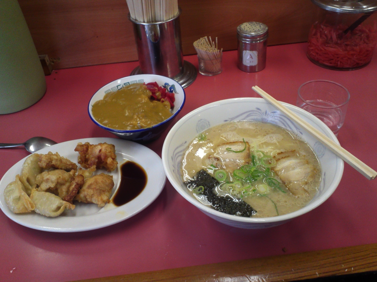 ビックリするほど安い。しかも意外とラーメンが、そこそこ美味しい。お店に入り560円の食券を買うと、ラーメンと(替え玉)から揚げ揚げ餃子、生野菜、カレー、漬物が食べ放題です。餃子やから揚げはそこそこなんですが、カレーがボテボテのルーで僕の好みにピッタリでした。