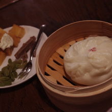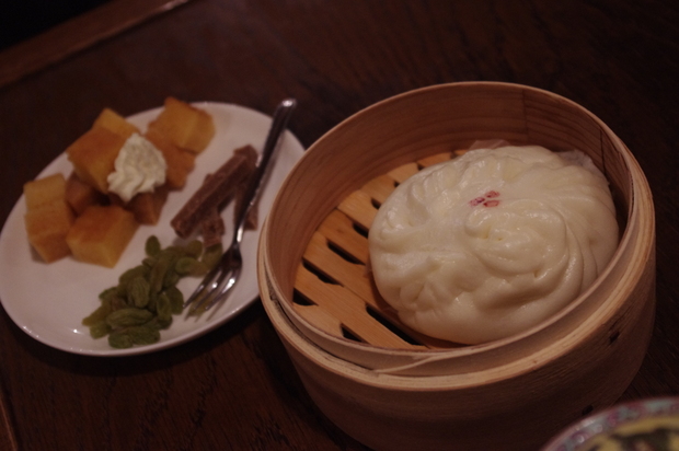 1、悟空セットという、肉まん(他の饅頭もあり)とマーライコー(中国風カステラ)とドライフルーツのセット。