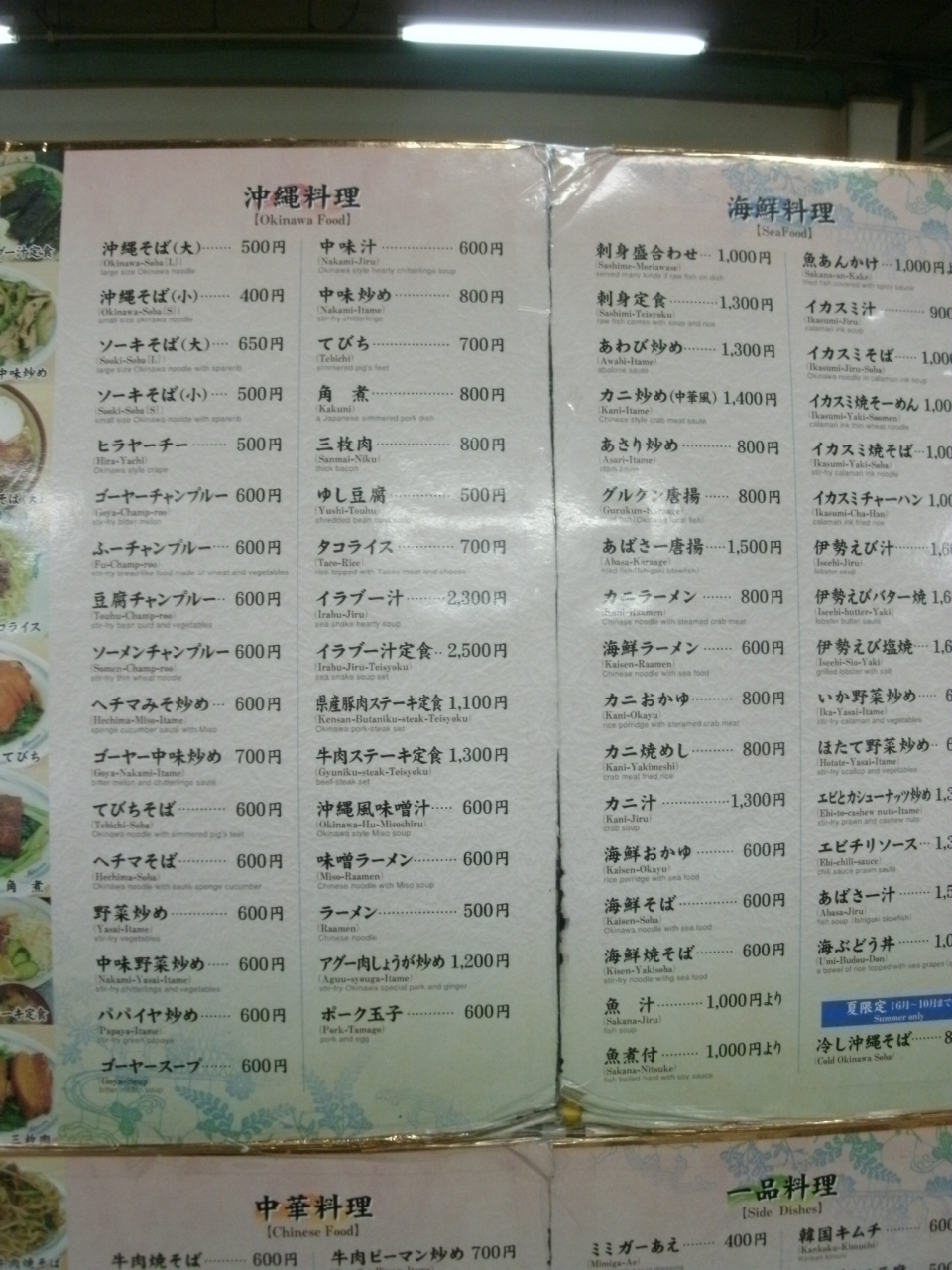 国際通りから徒歩で10分ほど、市場通りにある第一牧志公設市場の2階にある食堂です。2階には10軒ほどの食堂があるのですが、どれもオープン形式で、入り口とか、壁いう様な構造物はありません。どの店に入ろうかと迷っていると、店の人が超えを掛けて来ます。ここのお店は、沖縄郷土料理から海鮮料理、中華料理までメニューは幅広く、一部の物を除いて500~1000円程度で頂くことが出来ます。他の店も同じですが、1階の公設市場で買い求めた食材を希望に応じて料理して(有料)もらえます。