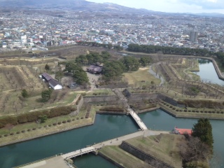 JR函館駅付近の路面電車に乗って行きました。片道220円でした。五稜郭前という駅があります。私はいきませんでしたが、近くに湯の川温泉という温泉街があるそうです。五稜郭タワーにのぼると、五稜郭の星形の地形がくっきりとみえますよ。