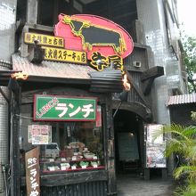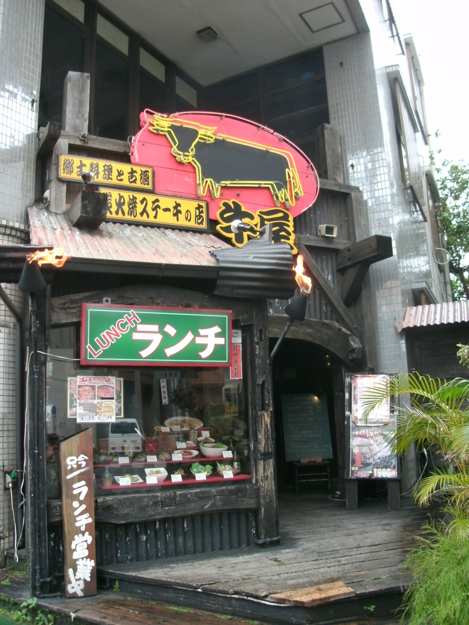 国際通りにあります。県庁前からだと500m位歩くと右手にあります。派手な看板が掛けてあり判りやすいです。店内は少し暗めで、夜は居酒屋さんになる様なスタイル。ランチのお肉が人気と聞いていたので入りました。私が“サーロインステーキ300g1680円”、家内が“サーロインステーキ200g1480円”をオーダー。ソースは店のオリジナルの醤油ベース。ステーキは予めカットされたもので、オーストラリア産ということであったが、そこそこ柔らかくて旨みもあり、ソースとの相性も良し。値段が値段なのでそれほど期待していなかったが、コスパ的にはマル。しかし、肉はナイフとフォークで食べたい。