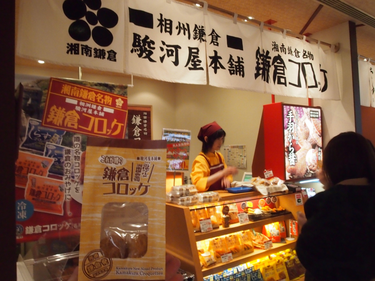 江ノ電の鎌倉駅構内に3/22にOPENしたばかりのエキナカです。 一つ一つの店舗は小さいですが、鎌倉土産として有名なお店が何軒か入ってます。 駿河屋本舗の鎌倉コロッケのお店もあり、揚げたてアツアツのコロッケを、1個から買うことが出来ます。 私はこの駿河屋本舗で鎌倉コロッケとしらす入りコロッケを買いました。 2個以上から個数割引があり、1個90円というのはなかなか手軽に食べられて嬉しいかも!