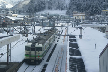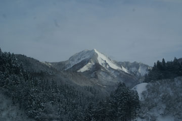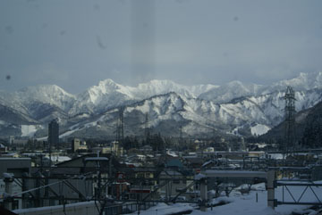 越後湯沢駅の跨線橋から、冬場はいつも雪雲に覆われて姿を表さない上越のマッターホルンの異名のある大源太山から上越国境の雪山が見えています。下り線の普通列車で次の石打駅に向かう途中で、岩原スキー場の上に聳える別名上田富士の飯士山が形を変えていきます。