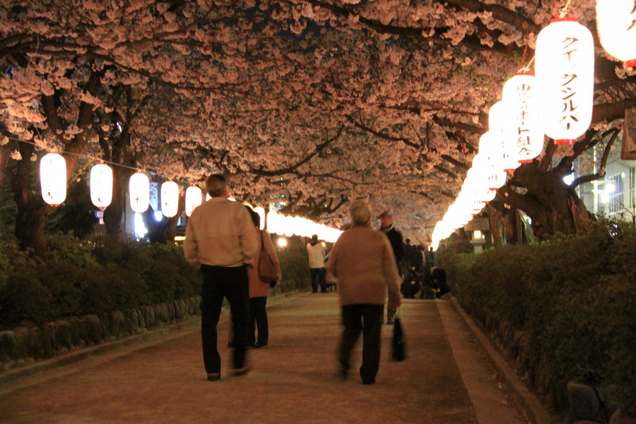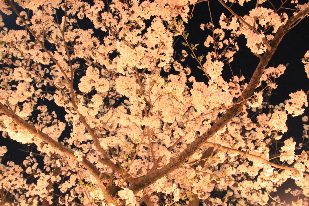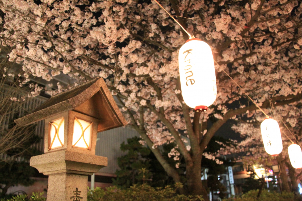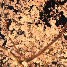 枝を左右に大きく延ばした姿は見られませんが、夜は提灯に灯がともり、夜桜も楽しめます。