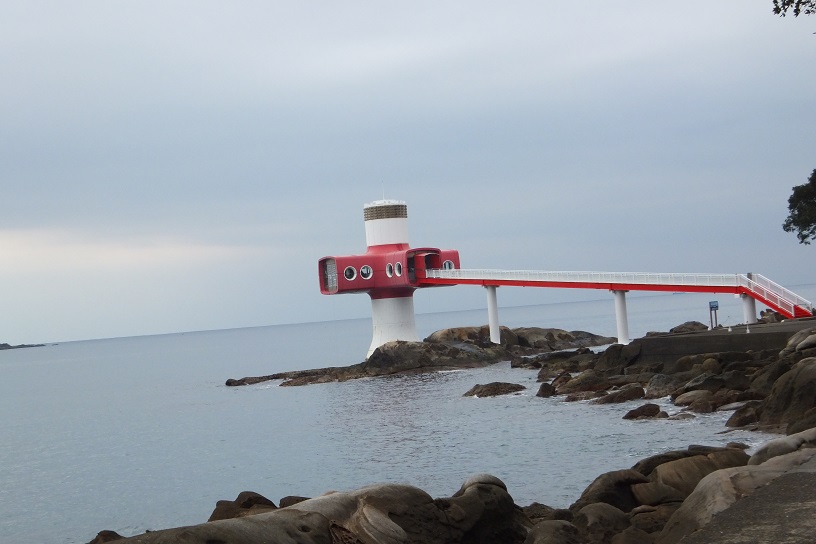 海底館は海に突き出た格好の建物、螺旋階段を降りていくとエントランスがあり