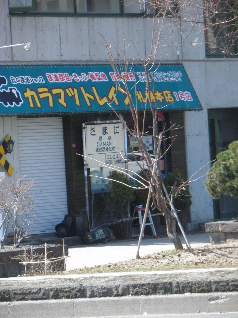 JR札幌駅の次の駅は苗穂駅で、その駅舎の向かい側に「さまに」の駅表示がある店が北の鉄道ショップ からまつトレインの札幌本店です。 鉄道関係のグッズ店なんですが、苗穂駅は小さい駅だけど、鉄道車両の苗穂工場があるので鉄道ファンが訪れるところです。
