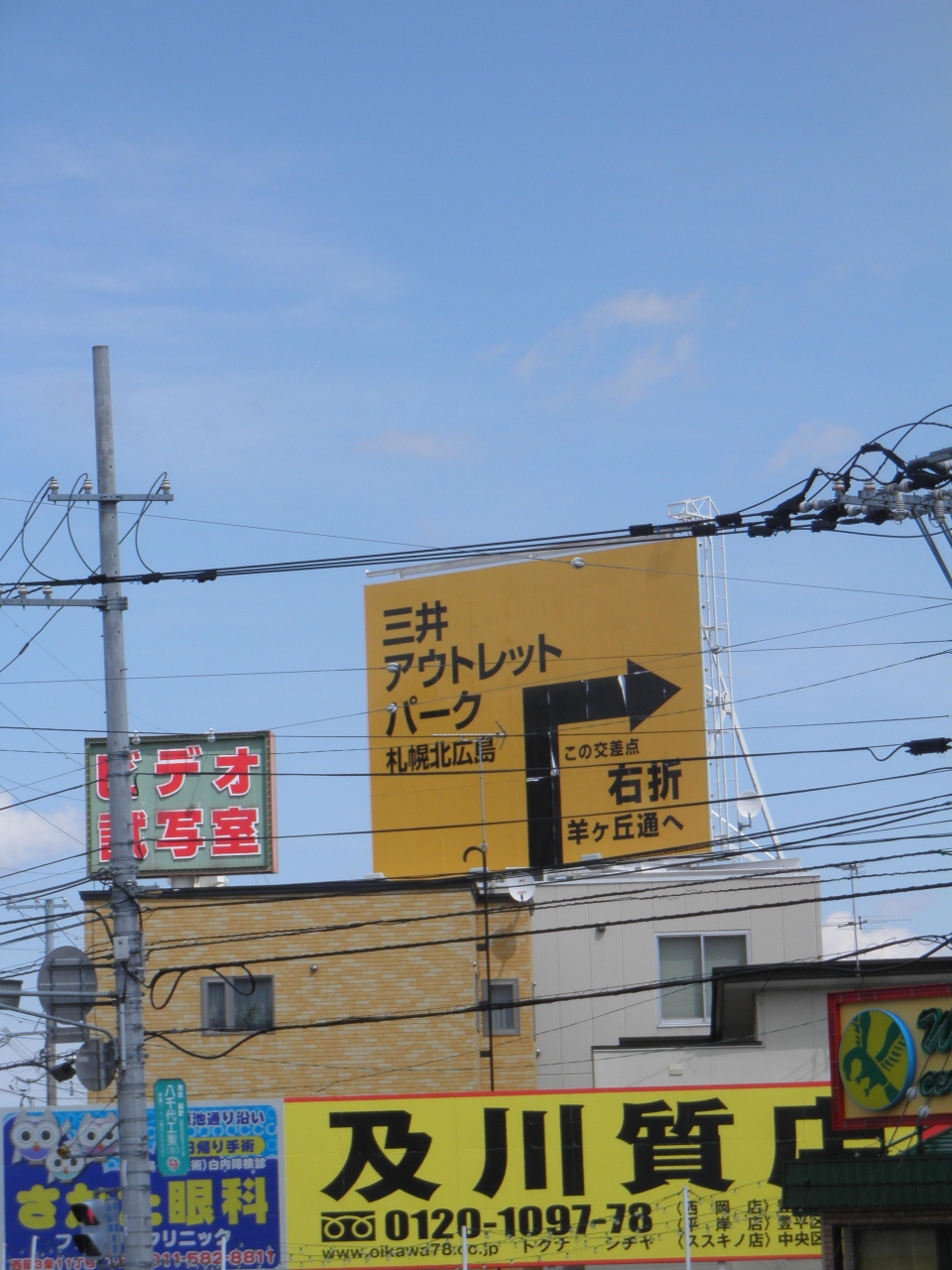 札幌のから新千歳空港に向かう途中にある北広島に三井アウトレットモールがあります。札幌市内から、道端に黄色い案内板があるのでわかりやすいです。 駐車場もたっぷりあるし、フードコートも充実していて、半日いても飽きませんでした。