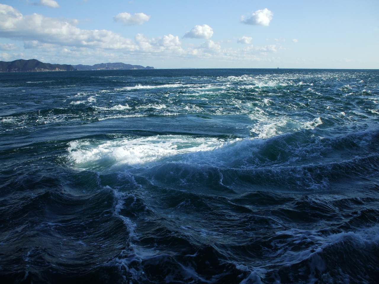 鳴門の渦潮を間近に見ようと、観潮船に乗り込みました。船の大きさは100人分ほどの座席があります。船の乗り場には広い待合室もあって休憩にもいいです。船は渦潮のできるあたりまで進み、しばらく停泊します。具合の良い日には結構大きな渦を巻くのが見られるそうです。でも、目の前でみると迫力があります。