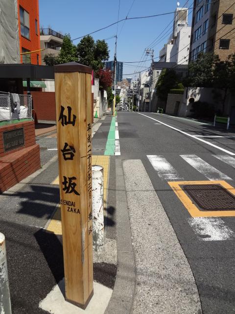 「坂の南部一帯が仙台藩伊達家の下屋敷であったところからその名に呼ぶことになった」と、坂の表示木に記されています。