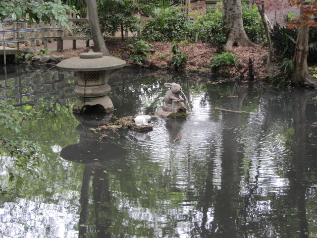 狛犬の代わりに「狛兎」。手水場にもウサギ、池(神池)で水を吹きだしているのもウサギです。