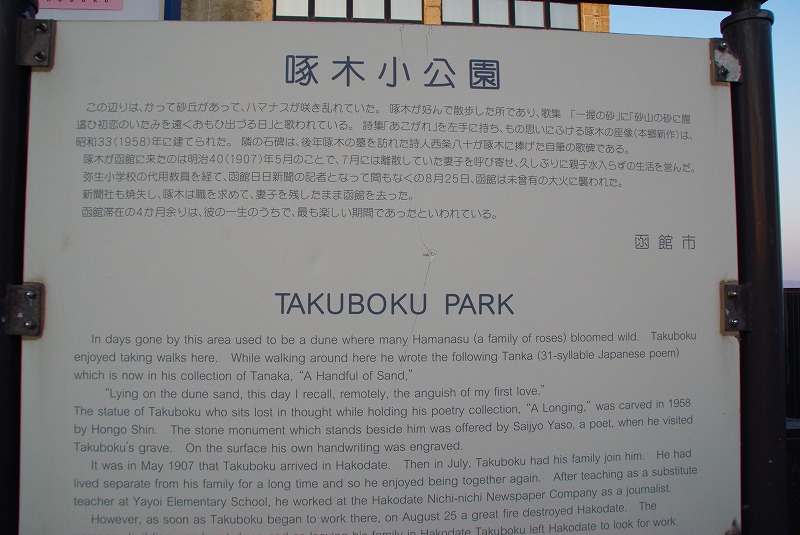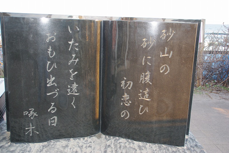 漁り火通りに面し、津軽海峡沿いにあります。ここには、石川啄木の銅像があります。まさしく「一握の砂」にふさわしい場所であり、その銅像です。この辺りはかつては砂丘で石川啄木が好んで散歩をした地だとか。隣の土方・啄木浪漫館を見学後啄木の銅像をご覧ください。夕暮れ時の撮影がおすすめです。
