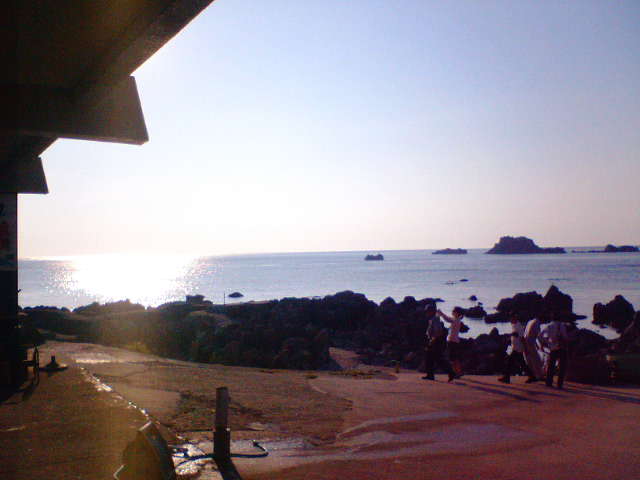 夕暮れ時、沈む夕日に照らされる岩と海面はなかなかの絶景です。
