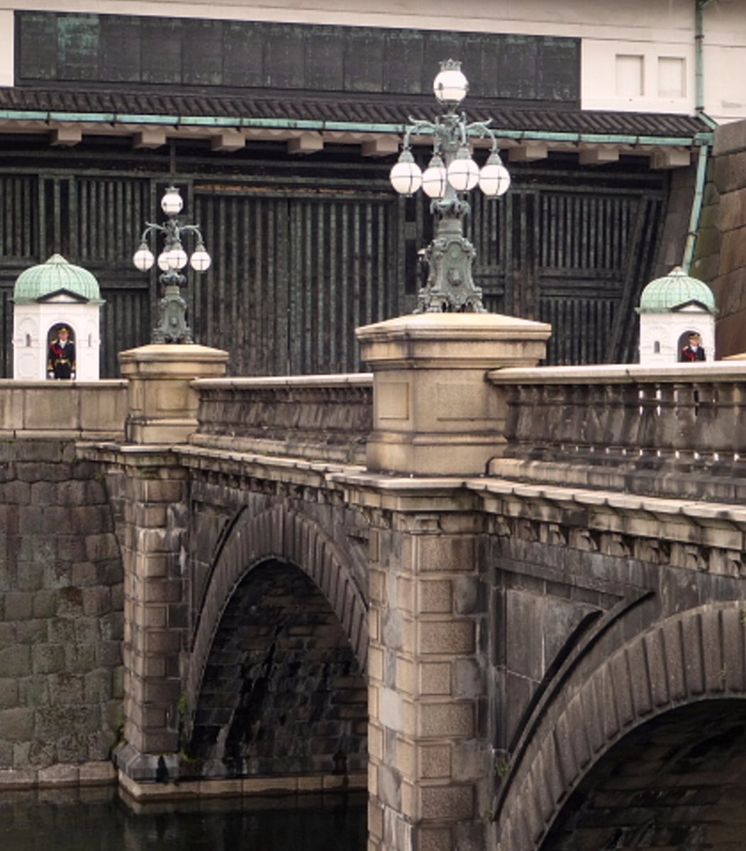 皇居正門と石橋. 伏見櫓をバックに架かる美しい石 造二連アーチ橋で、一般にはこの橋 が二重橋と思われていて、記念撮影 の定番となっています。都内に残る洋式石 造橋では二番目に古い橋です。正門の両脇には皇宮警察のお巡りさんが詰めてます。