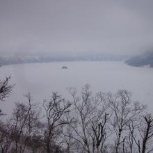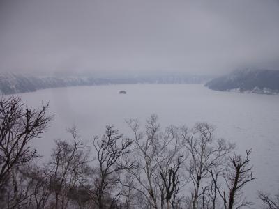 湖の中央に断崖の小島カムイシュ(神老婆島)がありますが、凍っている湖面からその姿を見ることができました。