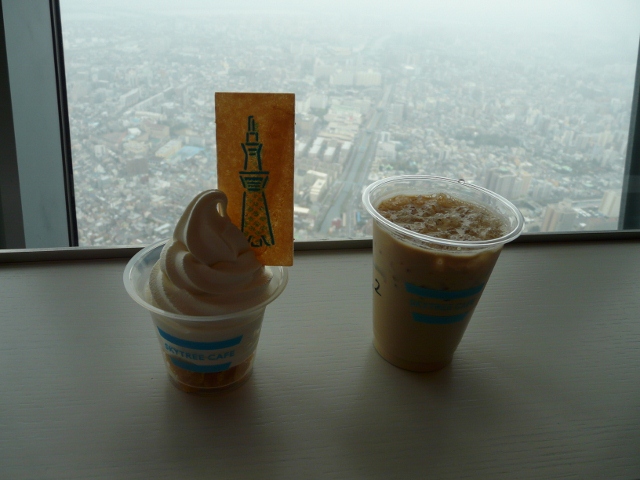 丁度窓側のカウンターが空いたので娘は「スカイソフト」を私は「アイスカフェオレ」をそれぞれ注文。イス席ではないですが眼下に広がる景色を見て美味しく頂くことができました。