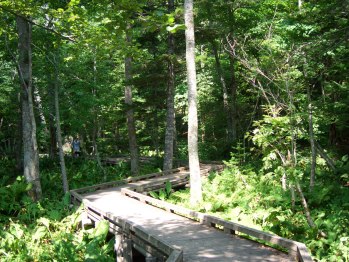阿寒湖エコミュージアムセンターの裏から出て遊歩道を歩きます。木道も部分的に整備されています。2つのコースがあるようですが、私は時間があまり無かったのでボッケまでしか歩きませんでした。青々とした森林の中を歩くのはじつに爽快ですね。