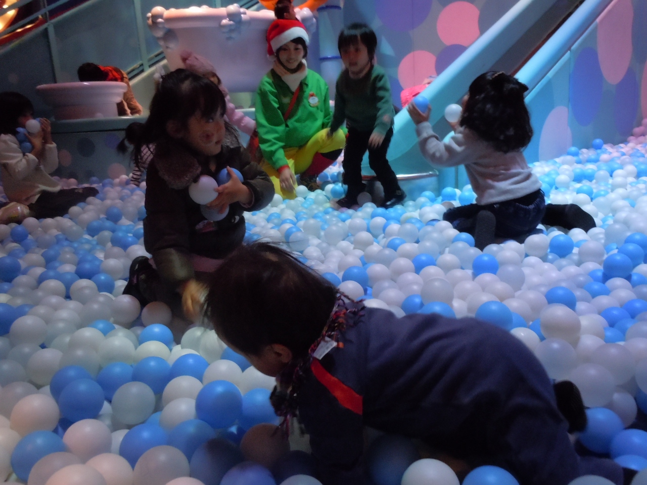 室内でも遊べるところが増え、特にボールプールが人気でした。なぜかポップコーンをこぼした子がいたみたいで(もちろんプール内には持ち込み禁止)、急きょ半分ほど立ち入り禁止にして取り除く作業をおこなっていました。プール内は靴で入って良いのですが(脱ぐと間違えたりして、なくなりそうですもんね)小さい子は口につけたりしますので気になる人はちょっと利用難しいかもしれません。滑り台もありますがキャストさんがついてくれていますのでぶつかったりのトラブルはありませんでした。