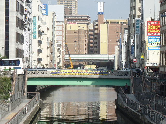 堺筋の橋で道頓堀川にかかる橋で交通量が多いです。地下鉄・近鉄日本橋駅から歩いて5分くらいで行けます。江戸時代からかかる橋で歴史があります。橋から道頓堀リバーウォークにつながる階段がありました。橋の側に観光バスが横付けしているのを見かけます。