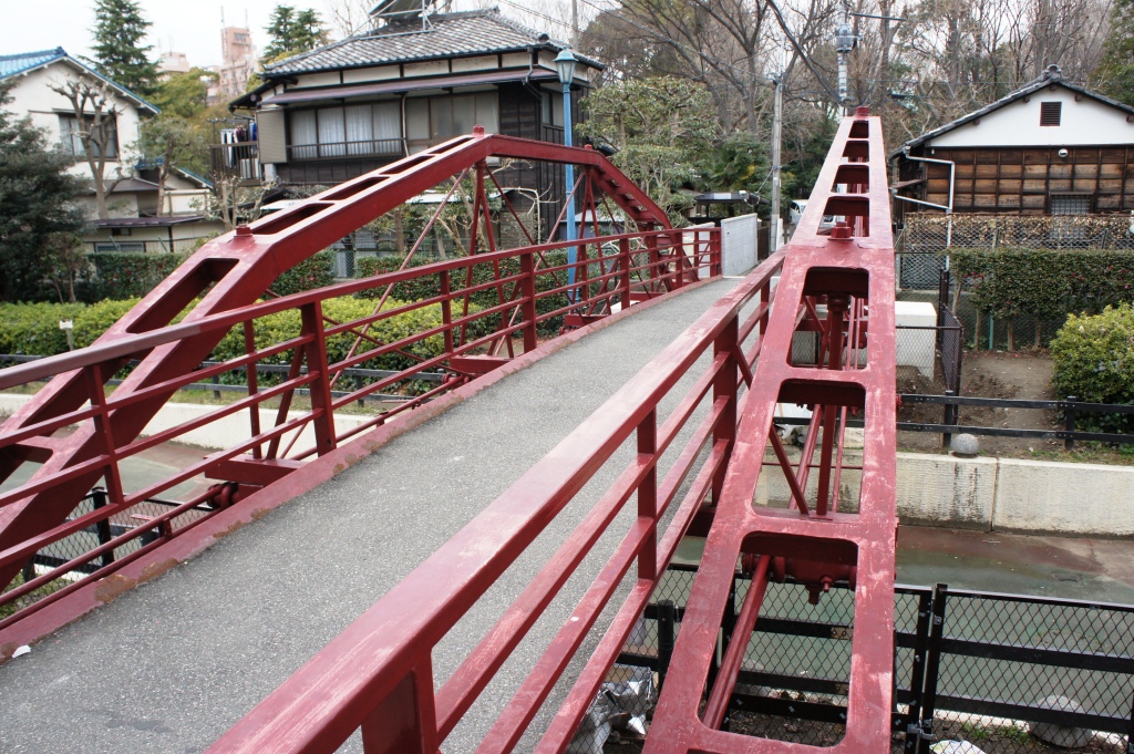 細い道路の上に架けられた歩道橋のような赤い橋。現在も歩行可能ですが、実は都内最古の鉄橋で国の重要文化財なのです。元々は明治11年、東京府の依頼により工部省赤羽製作所で鋳造され中央区の弾正橋として架けられましたが、関東大震災後、現在の場所に移されました。富岡八幡宮近くだから八幡橋になったとのこと。長さ15メートルの小さな橋で、今となってはちょっと唐突感がありますけどね。