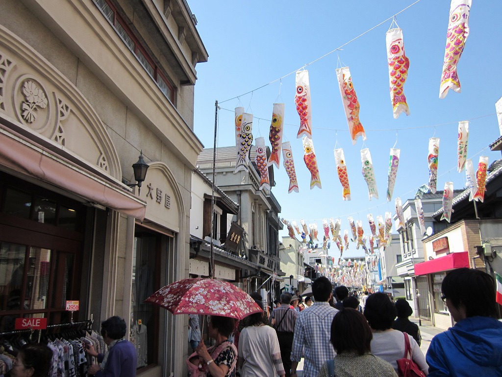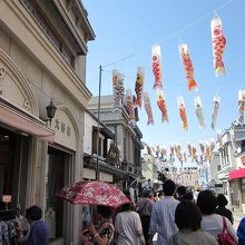 石畳が整備された通りに、レトロな建物が残っていたり、老舗のうなぎ屋があったりと歩いて楽しい通りです。GWには鯉のぼりも泳ぎます。