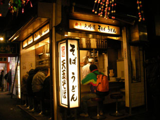 新宿西口の大ガードのそばに、再開発されないで残っている思い出横丁という一角があります。以前はしょんべん横丁と呼ばれていて、一部は火事があって立て直されましたが、中央の細い通りは昔のままです。そんな通りの真ん中にそば屋のかめやがあり、天ぷらそば330円という値段で、そばはなんということはありませんが、回転が速いので天ぷらは揚げたてを食べられます。