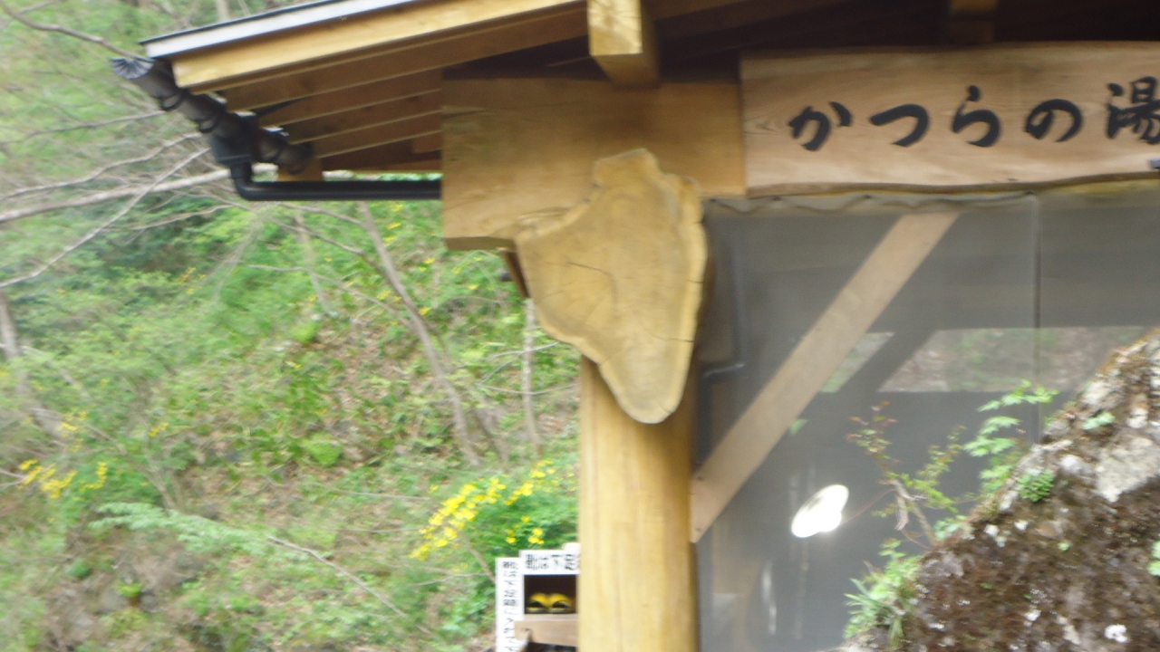 そこからずっと川の横の小道をずっと行くと岩風呂かつらの湯の看板が見えてきます。