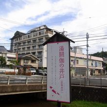 川沿いに建つ東屋にから玉湯川に遊ぶ鯉に餌をやる事ができます。