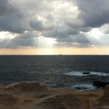 白浜に行ったら、千畳敷に行く、これは定番である。(ある意味、他に行く所があまり無い)昨年末ごろ、大阪市がガレキを試験焼却するとき、一時避難に友達が誘ってくれたので行った。写真のように、雲間から光が射していた。