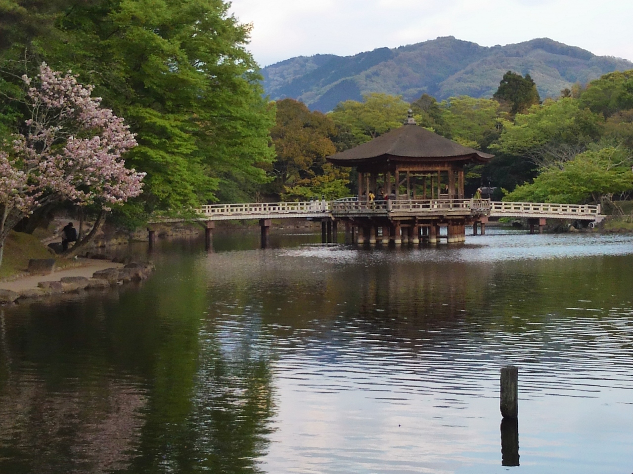 奈良公園にある鷺池に浮かぶ六角形のお堂です。