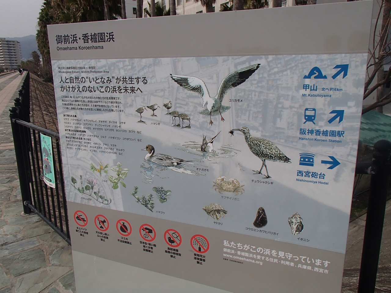 御前浜 (香櫨園浜) (オマエハマ コウロエンハマ) は、阪神香櫨園駅から歩いてくることができます。ここでは、香櫨園浜の鳥や草花を見る事ができます。ぜひ、一度、人と自然のいとなみが共生する、水辺を見に行って季節を感じてみてください
