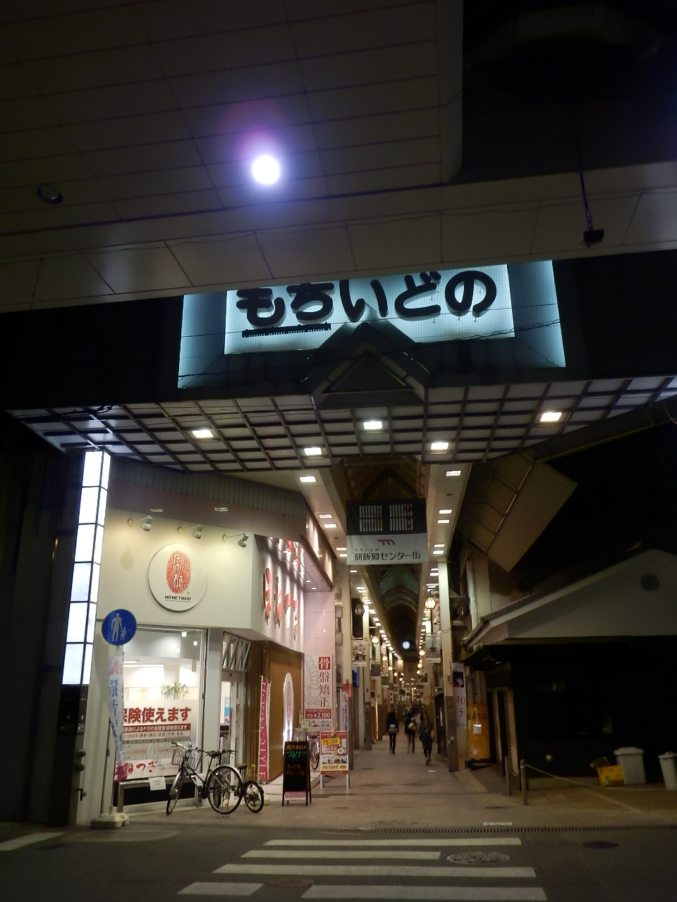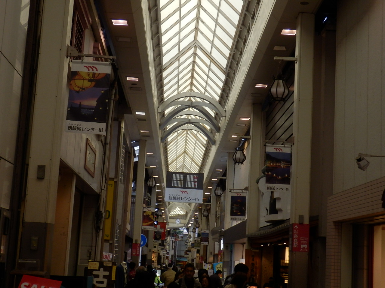 近鉄奈良駅から南へ、三条通りを跨ぐと見えてくるのが、こちらの南北に長いアーケード商店街です。商店街名はひらがなですが、住所表記の漢字は餅飯殿だそうです。並んでいるのは住民向けの服飾雑貨のお店が多いため、夜遅くに通ると閉まっているお店が多く、薄暗くて閑散としていました。