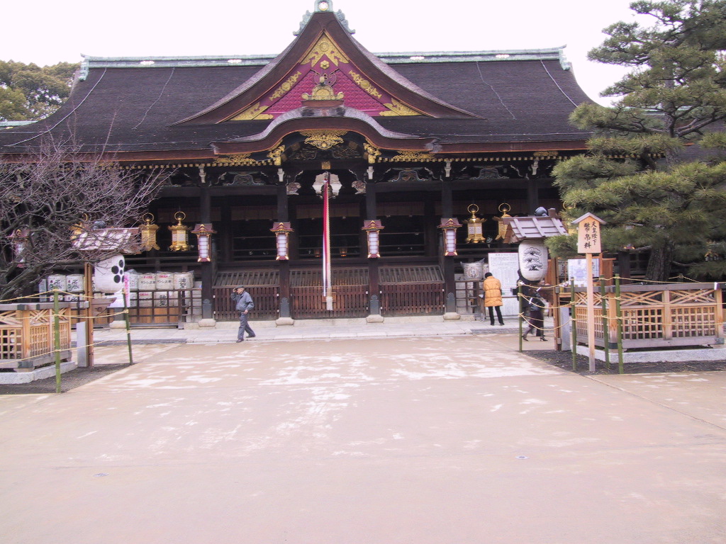 京都駅からバスで金閣寺へ向かう途中、乗車時間大体20分弱くらいの位置にあり、大通りに大きな石碑で北野天満宮とあり、すぐに分かります。