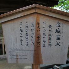 ここは、芋掘り藤五郎の砂金伝説の地。伝説は、貧しいけれど無欲で礼儀正しい若者、芋掘藤五郎が泥の芋をここで洗うと落とした泥から砂金が出て大金持ちの長者になりましたという話です。
